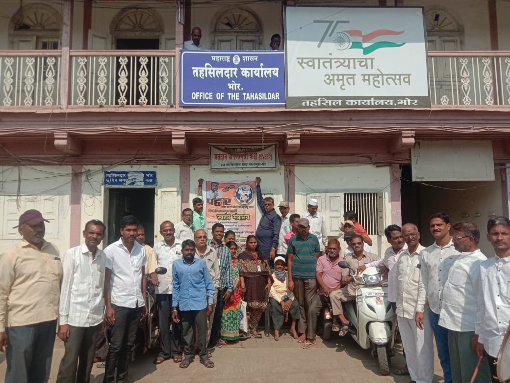 यावेळी तालुका प्रहार अपंग संघटनेचे अध्यक्ष बापू कुडले, भानुदास दुधाने, दत्ता हिंगे, राजकुमार मोरे, पांडुरंग दिघे, महिला अध्यक्षा मनीषा गायकवाड, सत्वशीला सणस, महेंद्र सोनवणे, महिला उपाध्यक्ष संगीता शिवतारे, गणपत धोंडे, प्रदीप शिनगारे, बाबू कंक, अमोल नांगरे, विठ्ठल बुदगुडे, मोहन शेटे तसेच भोर शहराध्यक्ष सतीश शिर्के, उपाध्यक्ष सुनील पळशीकर, सचिव अशोक मोरे, प्रिया शेख, महिला अध्यक्षा संगीता बहिरट, उपाध्यक्ष शाईन शेख, बबन शिंदे, बाळासाहेब उन्हाळकर, रोहिदास बोडके, अनिल गिरे रमेश गुरव प्रहार अपंग क्रांती संघटनेचे तालुक्यातील मोठ्या संख्येनेचे दिव्यांग बांधव उपस्थित होते