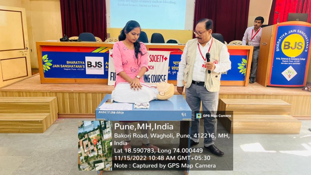 भारतीय जैन संघटनेचे कला विज्ञान व वाणिज्य महाविद्यालय वाघोली व ज्युनिअर तसेच युथ रेड क्रॉस समिती (इंडियन रेड क्रॉस) यांच्या संयुक्त विद्यमाने प्रथमोपचार ट्रेनिंग या एक दिवशीय कार्यशाळेची उद्घाटन डॉ. राजकुमार शहा संचालक प्रथमोपचार ट्रेनिंग इंडियन रेड क्रॉस समिती यांच्या हस्ते करण्यात आले.