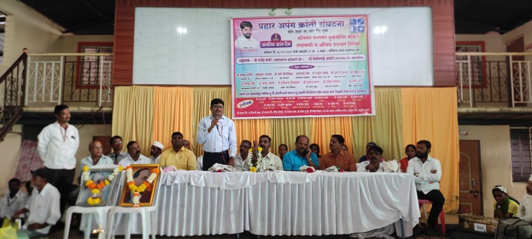 भोर तालुका व शहर अपंग क्रांती संघटनेच्या वतीने भोर मध्ये जागतीक अपंग दिन साजरा करण्यात आला. उत्रौली, ता.भोर येथील योगीराज मंगल कार्यालय येथे अपंग दिनाच्या कार्यक्रमाची सुरुवात भोरचे उपविभागीय अधिकारी राजेंद्र कचरे यांच्या हस्ते दिप प्रज्वलनाने करण्यात आली. यावेळी दिव्यांगांचे प्रलंबित प्रश्न तसेच दिव्यांगांच्या समस्यांसाठी प्रशासनाच्या वतीने नेहमीच सहकार्याची भूमिका राहिल. तसेच दिव्यांग बांधवांनी मतदार नाव नोंदणी करून घ्यावी असे प्रांताधिकारी कचरे यांनी मार्गदर्शन करताना सांगितले. यावेळी प्रांताधिकारी कचरे यांच्या हस्ते विविध क्षेत्रातील उल्लेखनीय कामगिरी करत असलेल्या दिव्यांगांना प्रमाणपत्र व ट्रॉफी देऊन सन्मानित करण्यात आले.