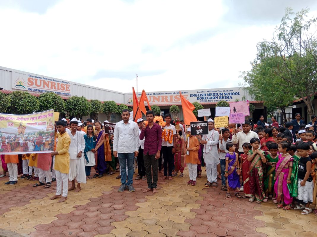 हातामध्ये भगवे झेंडे घेत, हरिनामाचा गजर करत ” ज्ञानोबा माऊली तुकाराम ” माऊली माऊली च्या जयघोषात ज्ञानांकुर शिक्षण प्रसारक मंडळाच्या सनराईज इंग्लिश मिडीयम स्कुल मध्ये भव्य दिंडी व पालखी सोहळ्याचे पारंपरिक पद्धतीने आयोजन करण्यात आले होते. आषाढी एकादशीच्या निमित्ताने कोरेगाव भीमा मध्ये काढण्यात आलेल्या पालखी सोहळ्यात तब्बल ६०० विद्यार्थी, पालक व शिक्षक ही सहभागी झाले होते.
