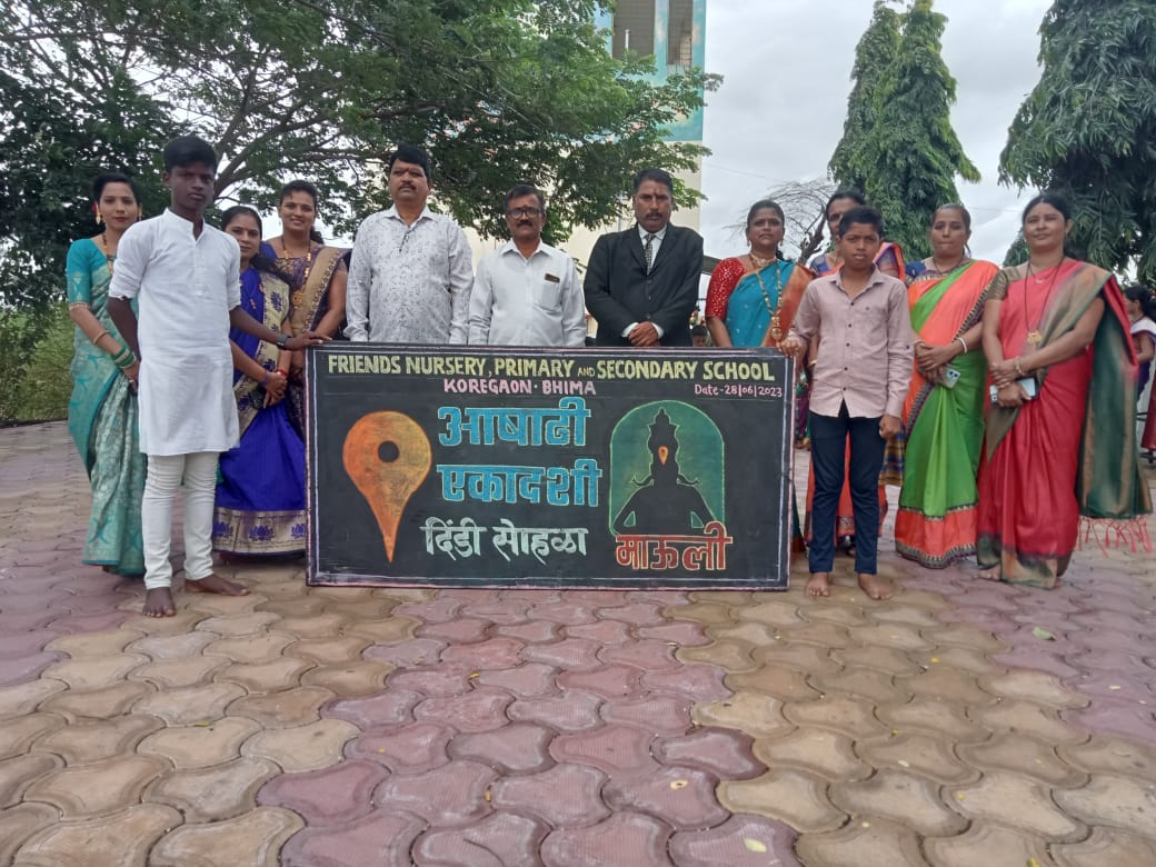 कोरेगाव भीमा, ता. शिरुर येथील फ्रेंड्स एजुकेशन इंस्टिट्युट संचालित फ्रेंड्स नर्सरी, प्रायमरी आणि सेकंडरी स्कुलच्या विद्यार्थ्यांनी आज फुगडी, भजन म्हणत व रिंगणही करीत आषाढी पालखी सोहळा साकारला.