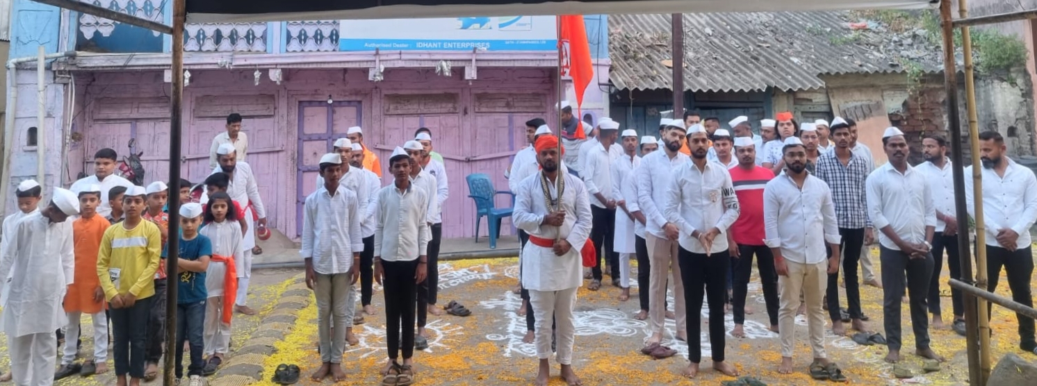 आदर्श चौकात आरती असल्याने आदर्श प्रतिष्ठान च्या स्वयसेवकांनी चौकात फुलांच्या पायघड्या, मध्यभागी भगवा ध्वज तर आकर्षक रांगोळी काढत फटाक्यांच्या आतिषबाजीत सर्वांचे स्वागत करण्यात आले.