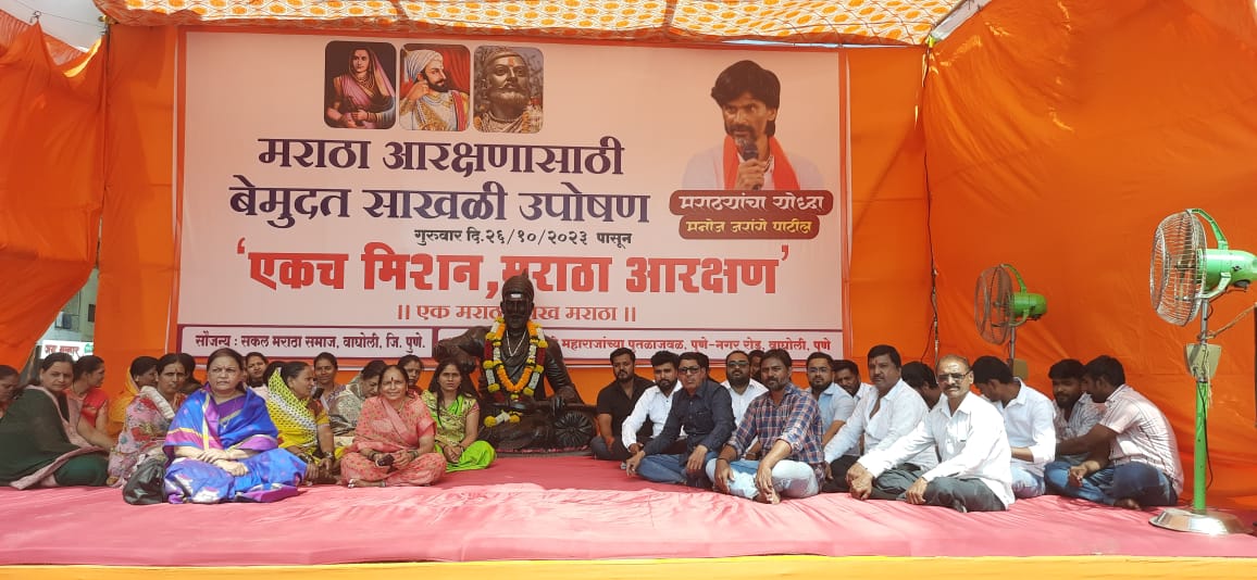 मराठा आरक्षणासाठी मनोज जरांगे पाटील यांनी राज्यातील प्रत्येक भागतील मराठा समाजाने साखळी उपोषण सुरु करावे असे आवाहन केले आहे. जरांगे पाटील यांचे आंतरवली सराटी येथे उपोषण सुरु आहे. त्याला प्रतिसाद देण्यासाठी वाघोली येथे पुणे-नगर महामार्गावर छत्रपती शिवाजी महाराजांच्या पुतळ्याजवळ सखल मराठा समाजाच्या वतीने बेमुदत साखळी उपोषण सुरु करण्यात आले आहे.