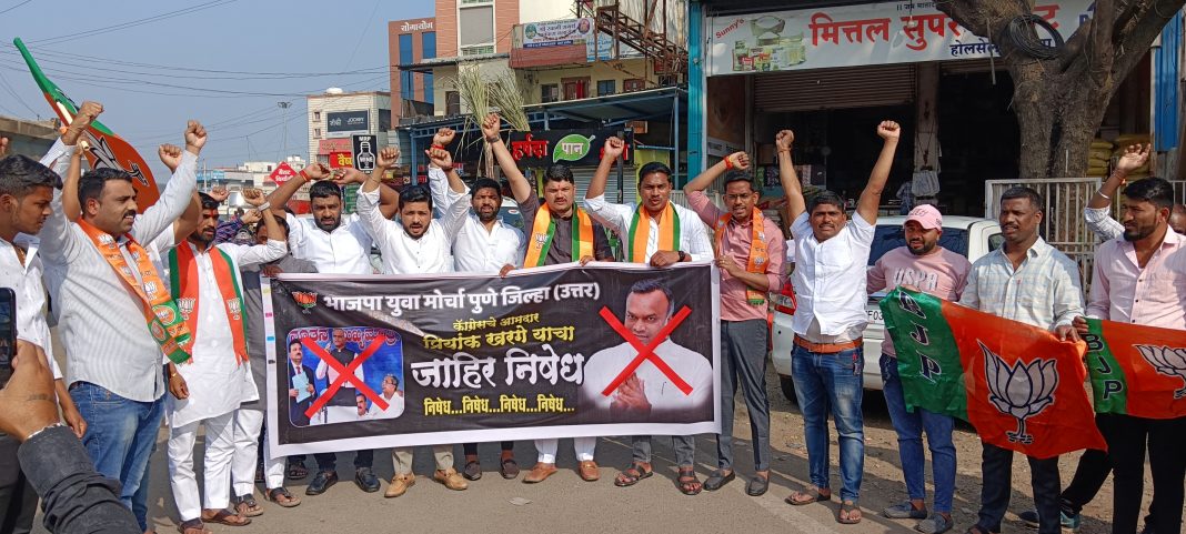 भाजप युवा मोर्चाच्या वतीने शिरूर तालुक्यातील कोरेगाव भिमा येथे कर्नाटक काँग्रेसचे मंत्री प्रियांक खर्गे यांच्या विरोधात जोरदार आंदोलन करत त्यांच्या प्रतिमेला जोडे मारण्यात आले. यावेळी भाजपा चे असंख्य पदाधिकारी व कार्यकर्ते मोठ्या संख्येने उपस्थित होते. यावेळी खर्गे यांचा निषेध करत घोषणाबाजी करण्यात आली.