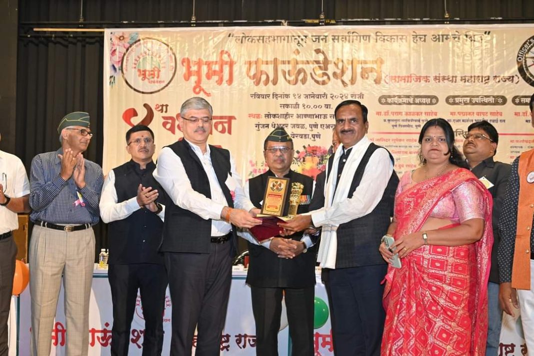 आदर्श समाजसेविका कै. सिंधुताई सपकाळ यांच्या कार्य प्रेरणेतून उभ्या असलेल्या अनाथ, निराधार, शेतकरी आत्महत्याग्रस्त मुलांना आणि वीर सेना पत्नींना मदतीच्या उद्देशातून प्रेरित असलेल्या भूमी फाउंडेशन या सामाजिक संस्थेचा चतुर्थ वर्धापन दिन नुकताच पार पडला. या वेळेस राज्यस्तरीय पुरस्कार वितरण करण्यात आले.