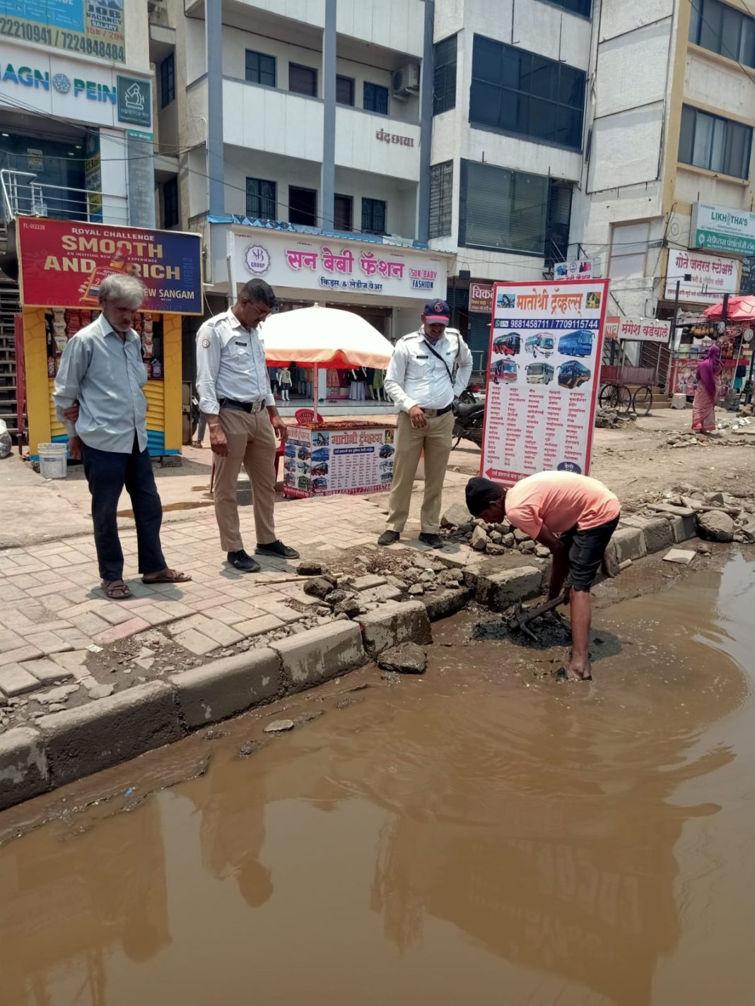 परंतु यांचे याकडे दुर्लक्ष असल्याने या साचलेल्या पाण्यामुळे वाहतूक कोंडी होत आहे. त्यामुळे अखेरीस वाहतूक शाखेच्या पोलीस कर्मचाऱ्यांनी स्वतः पुढाकार घेत महामार्गावर साचलेले पाणी काढून देत महामार्ग मोकळा केल्याचे पाहायला मिळाले.