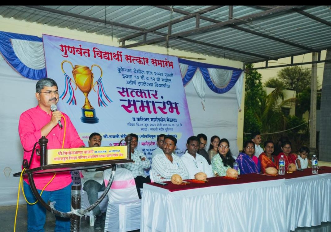 बुर्केगाव, ता. हवेली येथे माजी सरपंच नितीन आप्पा बाजारे युवा मंचच्या माध्यमातून यंदाच्या वर्षी दहावी व बारावी उत्तीर्ण विद्यार्थ्यांचा सत्कार समारंभ व करिअर मार्गदर्शन मेळावा नुकताच संपन्न झाला. यावेळी १० वी, १२ वी उत्तीर्ण अशा ६५ विद्यार्थींचा सन्मान चिन्ह देऊन सन्मान करण्यात आला. कार्यक्रमाच्या अध्यक्षस्थानी सरपंच रुपाली थोरात होत्या.