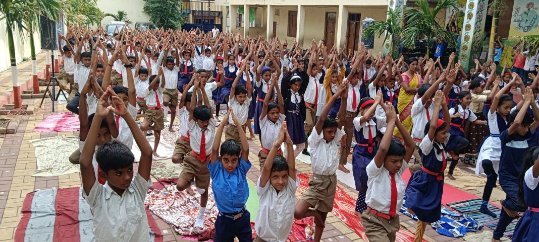 यावेळी विविध आसणे, योगासने, सूर्यनमस्कार अशाच प्रकारचे अनेक योगासने विद्यालयातील शिक्षक तुकाराम सातकर गणेश दाते यांनी विद्यार्थ्यांसमोर करून दाखवत विद्यार्थ्यांकडून करून घेतली.
