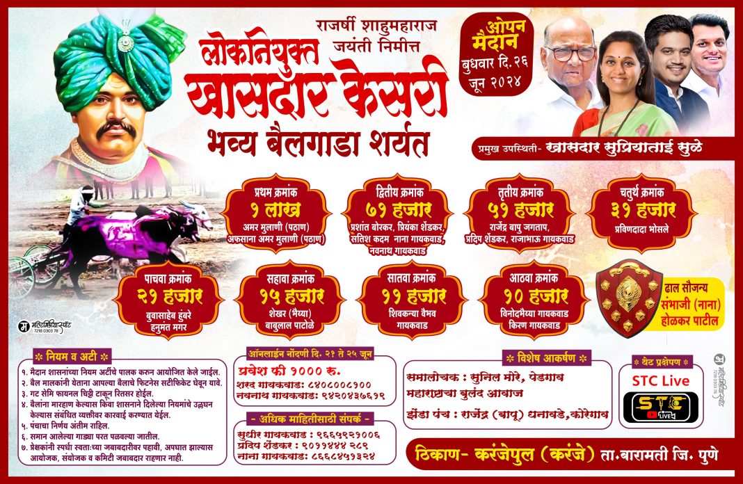 येत्या २६ जून रोजी बारामती तालुक्यातील करंजेपूल (करंजे) येथे राजश्री शाहुमहाराज जयंती निमित्त लोकनियुक्त खासदार केसरी भव्य बैलगाडा शर्यतीचे आयोजन करण्यात आले असल्याची माहिती आयोजकांच्या वतीने आपली लोकशाही देण्यात आली. या शर्यतीसाठी बारामती लोकसभेच्या नवनिर्वाचित खासदार सुप्रिया सुळे यांची प्रमुख उपस्थिती असणार आहे.