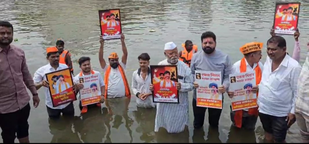 मराठा संघर्ष योद्धा मनोज जरांगे पाटील यांनी मराठा आरक्षण मिळावे तसेच जरांगे पाटील यांनी विविध मागण्यांसह मराठा आंदोलकांवर शासनाने दाखल केलेले गुन्हे मागे घेण्यासह केलेल्या इतर मागण्यांना जाहीर पाठिंबा देत मराठा आरक्षण मागणीस सकल मराठा समाज आळंदी देवाची पंचक्रोशी यांचे वतीने आळंदीतील इंद्रायणी नदीत उतरून जल आंदोलन करण्यात आले.