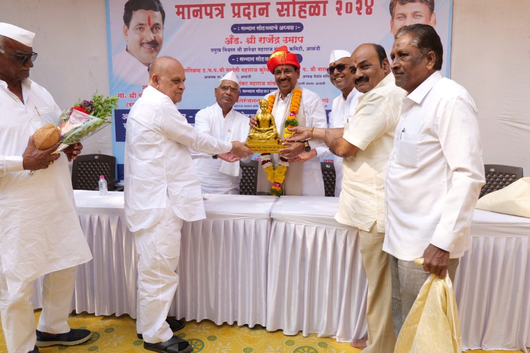 ओळख श्री ज्ञानेश्वरी – एक परिवार समिती, श्री ज्ञानेश्वर महाराज चरित्र समिती यांचे वतीने मानपत्र प्रदान सोहळ्याचे आयोजन करण्यात आले. यावेळी अध्यक्ष स्थानी ह. भ. प. शंकर महाराज पांचाळ गुरुजी होते.
