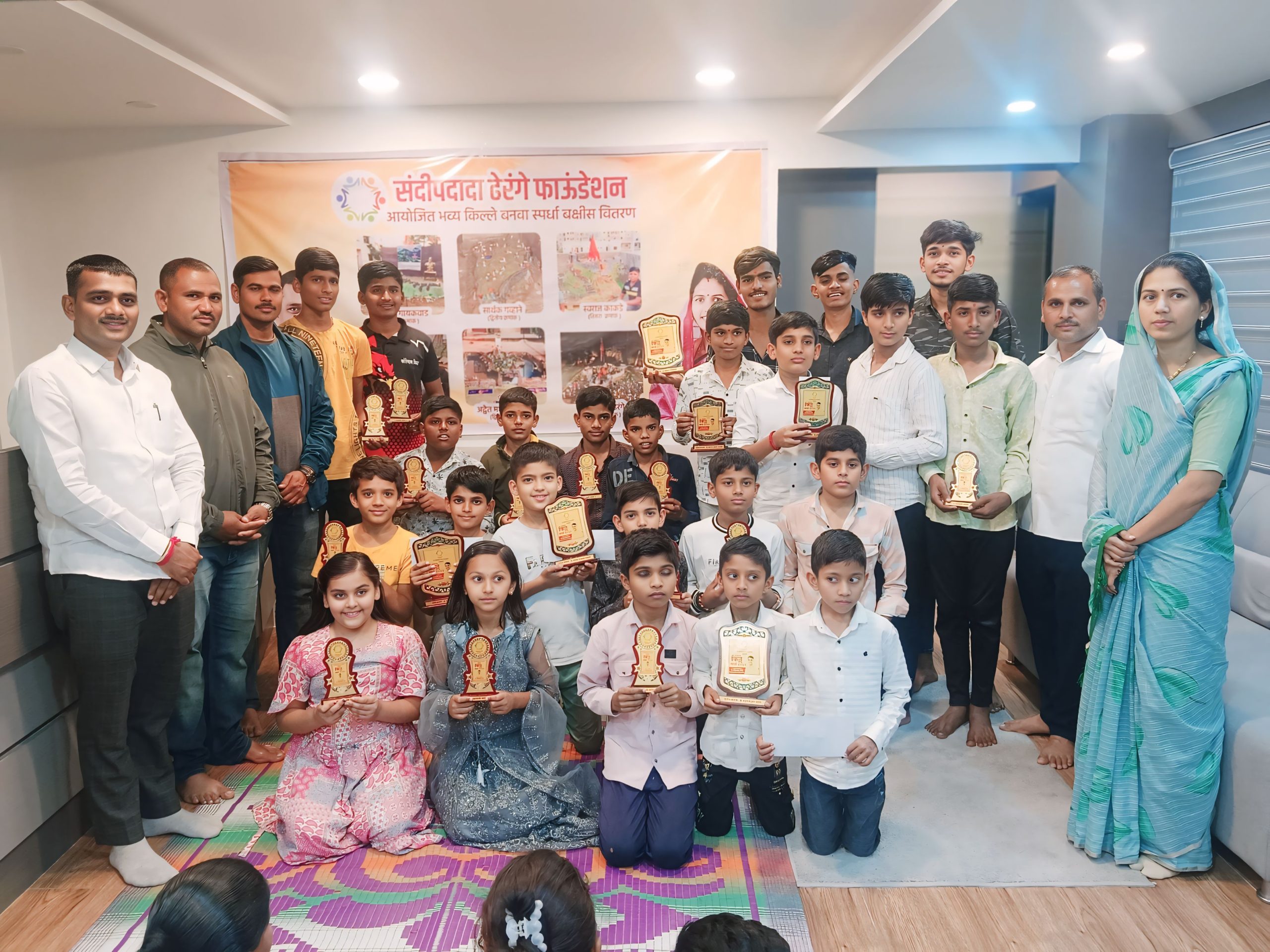 तर लहान गटातील विजेते पुढील प्रमाणे :- प्रथम क्रमांक :- प्रणव घावटे (किल्ले जंजिरा), द्वितीय क्रमांक – अद्वैत घावटे (किल्ले जंजिरा) तर तृतीय क्रमांक – हर्षराज ढेरंगे (किल्ले मल्हार गड) या स्पर्धकांना चषक देऊन तर सहभागी स्पर्धकांना देखील चषक देऊन संदीपदादा ढेरंगे फाऊंडेशन च्या वतीने गौरविण्यात आले.