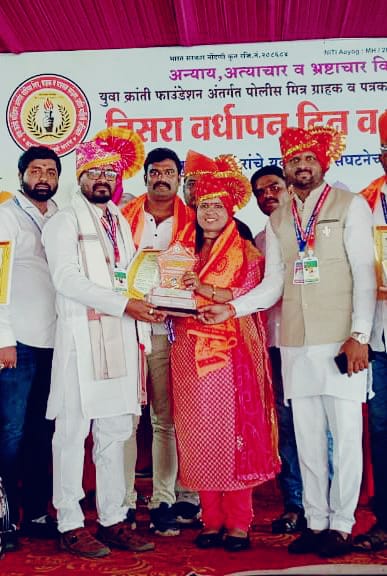 युवा क्रांती फाउंडेशन अंतर्गत पोलीस मित्र ग्राहक व पत्रकार संरक्षण आणि माहिती अधिकार संघटनेच्या राष्ट्रीय कार्याध्यक्ष अमृता पठारे त्यांना नुकताच युवा क्रांती फाउंडेशन संस्थेच्या वर्धापन दिनानिमित्त शिर्डी येथे झालेल्या विशेष कार्यक्रमात महाराष्ट्र भूषण पुरस्काराने सन्मानित करण्यात आले.