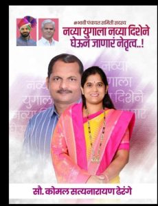 कुटुंबातील सामाजिक कार्याचा वारसा पुढे चालविण्यासाठी कोरेगाव भिमा येथून कोमल सत्यनारायण ढेरंगे या शिरूर पंचायत समितीच्या कोरेगाव भीमा – सणसवाडी – वाडा पुनर्वसन या गणातून निवडणुकीच्या रिंगणात पूर्ण ताकतीनिशी उतरण्यासाठी सज्ज असून महिला वर्गामध्ये लोकप्रियतेचा आपल्याला नक्कीच फायदा होईल असा विश्वास त्यांनी व्यक्त केला.