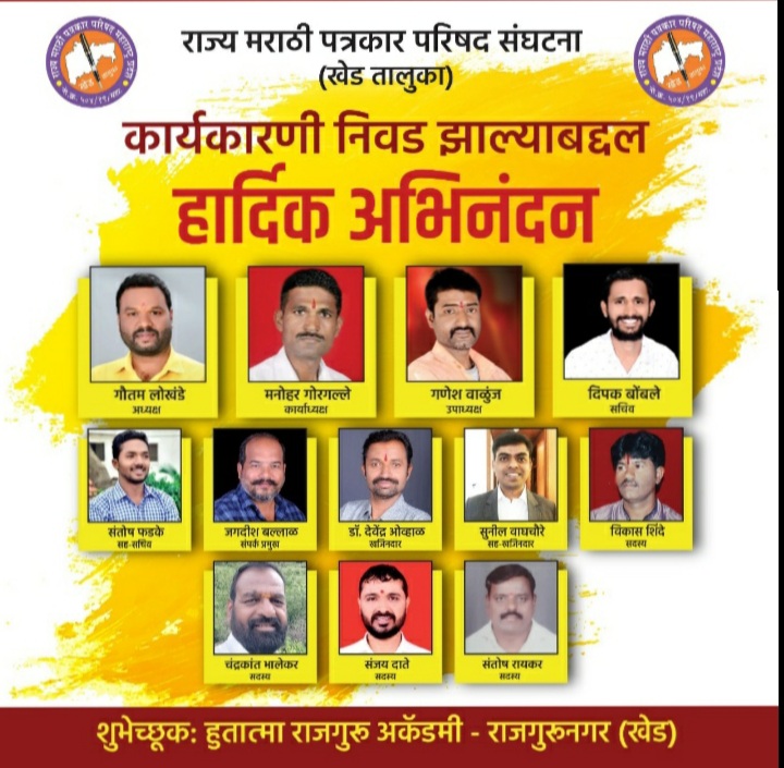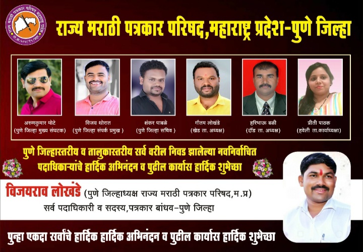 यामध्ये राज्य मराठी पत्रकार परीषद, महाराष्ट्र प्रदेशच्या पुणे जिल्हा मुख्य संघटकपदी अरूणकुमार मोटे, पुणे जिल्हा संपर्क प्रमुख पदी विजय थोरात, जिल्हा सचिव पदी शंकर पाबळे तसेच खेड (राजगुरूनगर) तालुकाध्यक्ष पदी गौतम लोखंडे, खेड तालुका उपाध्यक्ष गणेश वाळुंज, हवेली तालुका कार्याध्यक्षपदी प्रीती पाठक, दौंड तालुकाध्यक्ष पदी हरिभाऊ बळी, शिरूर ता.सचिव शौकत शेख, शिरूर तालुका खजिनदार एकनाथ थोरात, खेड (राजगुरूनगर) तालुका कार्याध्यक्ष मनोहर गोरगल्ले, खेड ता. सचिव दिपक बोबले, खेड ता. खजिनदार देवेंद्र ओव्हाळ, खेड ता. सहसचिव संतोष फडके, खेड ता. सहखजिनदार सुनील वाघचौरे, खेड ता. संपर्क प्रमुख जगदीश बल्लाळ, शिरूर सदस्य सुजित मैड, खेड सदस्य संजय दाते, विकास शिंदे, संतोष सायकर, चंद्रकांत भालेकर आदींची निवड करण्यात आली.