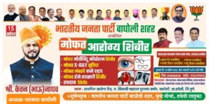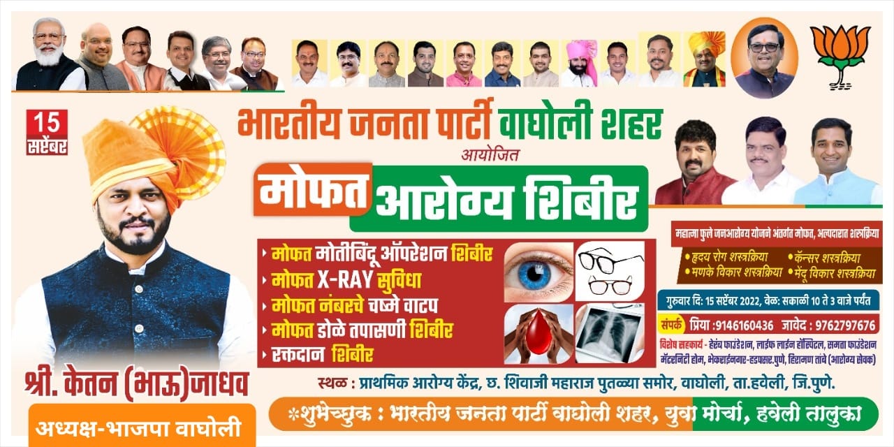 वाघोली येथे छत्रपती शिवाजी महाराज चौकासमोर प्राथमिक आरोग्य केंद्र येथे भारतीय जनता पार्टीच्या वतीने भव्य आरोग्य शिबिराचे आयोजन गुरुवार (दि. १५ सप्टेंबर) रोजी (सकाळी १० ते ३ वा.) करण्यात आले असून मोतीबिंदू ऑपरेशन, डोळे तपासणी, चष्मे वाटप, एक्स रे तपासणी मोफत करण्यात येणार आहे. तसेच महात्मा फुले जन आरोग्य योजने अंतर्गत माहिती व हृदय शस्त्रक्रिया, मेंदू विकार शस्त्रक्रिया, कॅन्सर, मणका विकार शस्त्रक्रिया अल्पदरात करण्यात येणार आहेत. तसेच रक्तदान सुद्धा करण्यात येणार असल्याची माहिती भारतीय जनता पार्टीचे वाघोली शहर अध्यक्ष केतन जाधव यांनी दिली आहे.